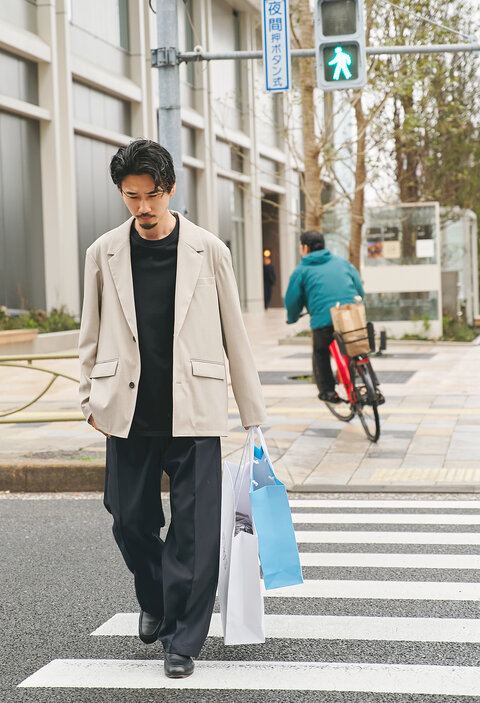 街を歩く時間にも、自然と馴染むジャケットスタイル。軽やかで都会的な印象に。